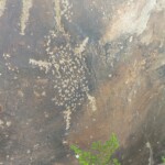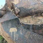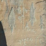En esa ocasión, tomando unas fotos, el ingeniero Herrera llegó al sitio y quedó sumamente admirado de ver tanto grabado, llamándole poderosamente la atención unos grabados de figuras alineadas a las que les llamó “fantasmitas” colgados de una cuerda, le celebré la ocurrencia y le indiqué que se trataba no de un tendedero de ropa de “fantasmitas”, sino una sucesión de flechas alineadas y con la punta hacia abajo; para el ingeniero y amigo Pepe Ventura ésta es una característica muy propia de estos lugares, una marca quizá territorial como lo son los mismos hongos, quizá el hecho de que no se hayan grabado propulsores nos den una idea de que las figuras son tardías, ya de la época en que se inventó el arco y la flecha; los hongos son bastante representados en este sitio que pudiera tratarse de la onda o mejor como he dicho en otras ocasiones, es un símbolo territorial la representación de este símbolo hongo es muy socorrido en este sitio, a vuelo de pájaro se pueden ver una infinidad de ellos.