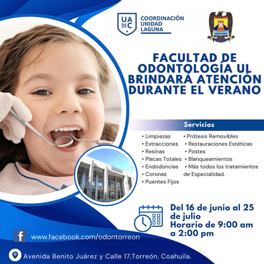 Los servicios estarán disponibles durante este mes hasta el 25 de julio, en un horario de 9:00 de la mañana a 2 de la tarde en las instalaciones de la Facultad de Odontología Unidad Laguna, ubicada en Avenida Benito Juárez y calle 17 (frente al estadio Revolución).