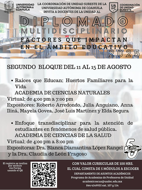 SALTILLO, Coahuila. 3 de julio de 2025. La Universidad Autónoma de Coahuila, a través de la Coordinación de Unidad Sureste y su Departamento de Asuntos Académicos, invita a docentes de US a tomar los Cursos “Raíces que educan: huertos familiares para la vida” y “Enfoque transdisciplinar para la atención de estudiantes en fenómenos de salud pública”, que se llevarán a cabo del 11 al 15 de agosto de 2025 a través de la plataforma Microsoft Teams.