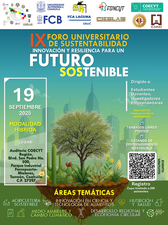 TORREÓN, Coahuila. 1 de agosto de 2025. La Universidad Autónoma de Coahuila a través de la Facultad de Ciencias Biológicas, llevará a cabo el 19 de septiembre de 2025 el IX Foro de Universitario de Sustentabilidad “Innovación y Resiliencia para un Futuro Sostenible”, de manera virtual y presencial en el Auditorio COECYT Región.