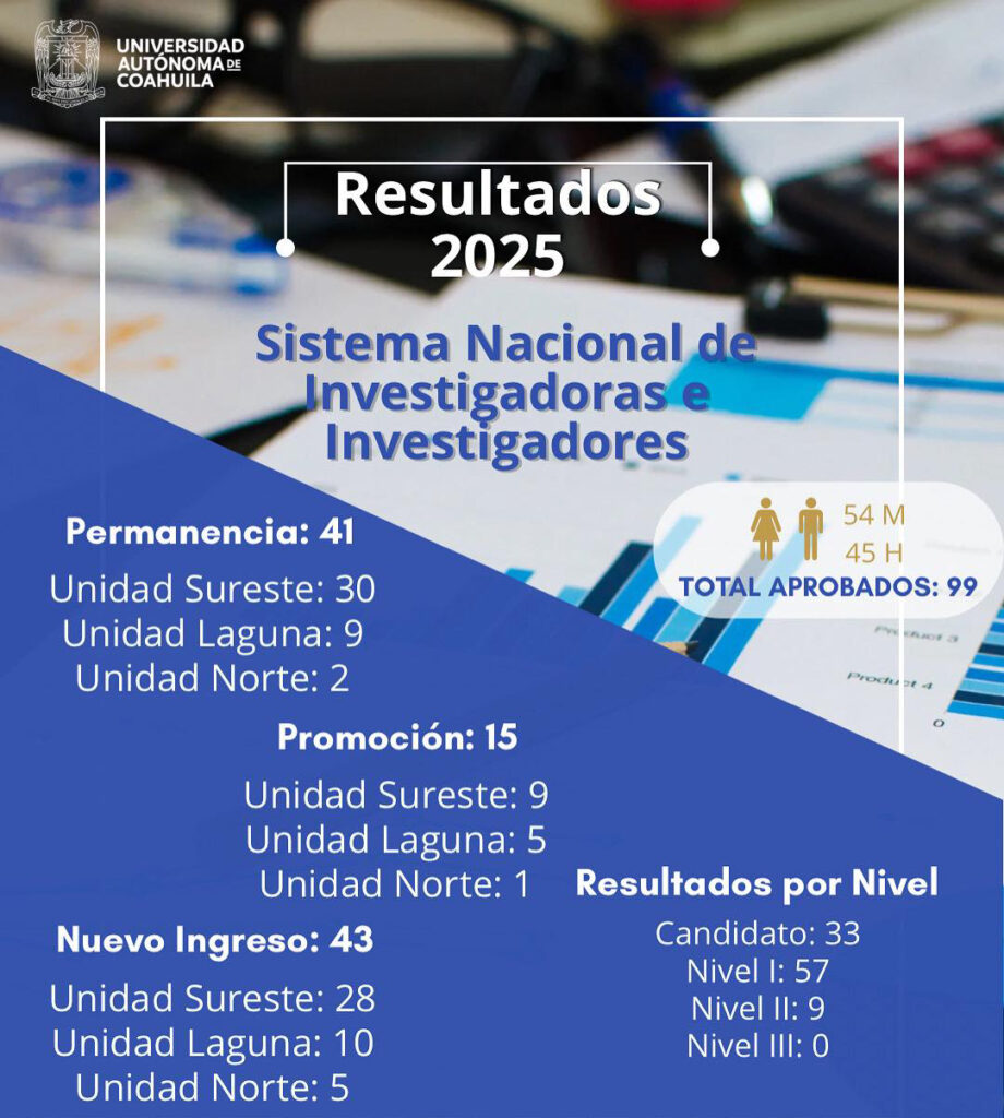 Con estos resultados, a partir de enero de 2026 la UAdeC contará con 433 miembros en el SNII, con una distribución por nivel de reconocimiento de 117 investigadores en el Nivel Candidato, 273 en el Nivel I, 33 en el Nivel II, nueve investigadores en el Nivel III y un investigador con reconocimiento Emérito; lo que representa un incremento del 16% para investigadores en el nivel Candidato, un 1% en el Nivel I y 27% en el Nivel II en el periodo de 2025 al 2026.