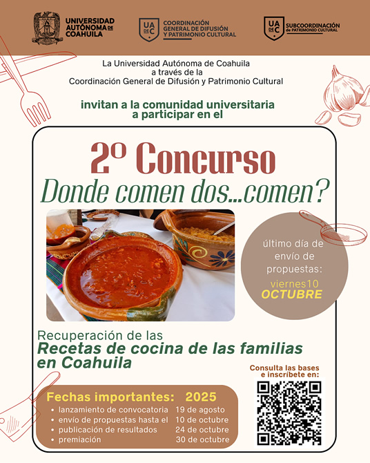 SALTILLO, Coahuila. 19 de agosto de 2025. La Universidad Autónoma de Coahuila a través de la Coordinación de Difusión y Patrimonio Cultural (DPC), invita a la comunidad universitaria de las Unidades Sureste, Laguna y Norte a participar en el “Segundo Concurso Universitario de Rescate de Patrimonio Inmaterial: Donde comen dos, comen…”, cuyo objetivo principal es la recuperación de recetas tradicionales de las familias coahuilenses.