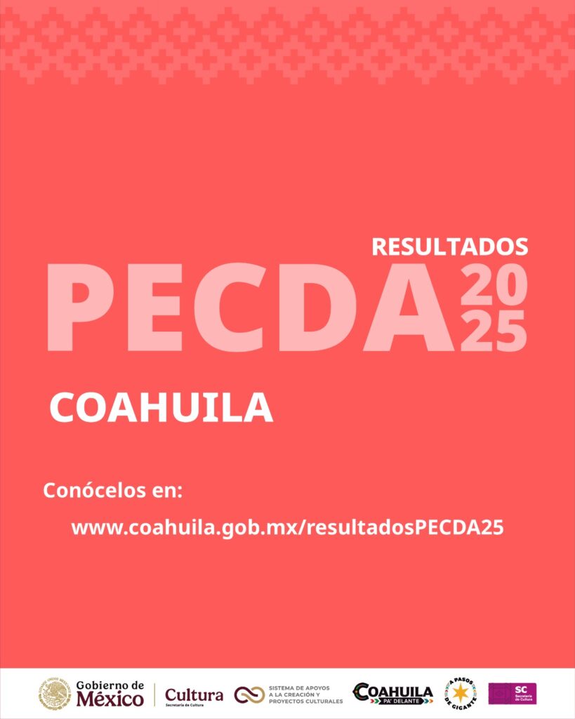 Saltillo, Coahuila a 19 de agosto de 2025.- El Gobierno del Estado de Coahuila de Zaragoza, a través de la Secretaría de Cultura de Coahuila, en colaboración con la Secretaría de Cultura del Gobierno de México, a través del Sistema de Apoyos a la Creación y Proyectos Culturales (SACPC), dan a conocer los resultados de la convocatoria PECDA2025.