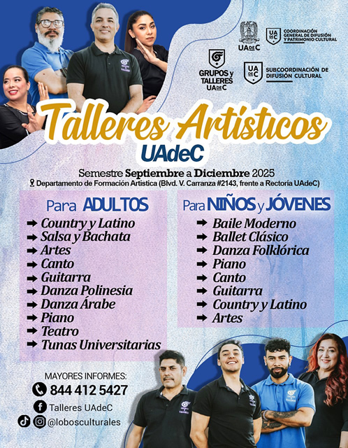 Para más información, comunicarse al Departamento de Formación Artística de Grupos y Talleres de la UAdeC al teléfono (844) 412 54 27 o en la página de Facebook “Talleres UAdeC” https://www.facebook.com/profile.php?id=100057597992885.