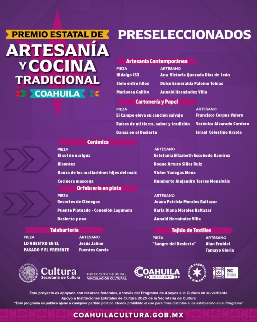 Saltillo, Coahuila de Zaragoza; a 21 de agosto de 2025.- El Gobierno del Estado de Coahuila, a través de la Secretaría de Cultura, dio a conocer a las y los preseleccionados en la categoría de Artesanía del Premio Estatal de Artesanía y Cocina Tradicional Coahuila 2025, certamen que busca reconocer y estimular el patrimonio cultural inmaterial de nuestro estado, especialmente el trabajo de artesanas, artesanos y cocineras tradicionales.
