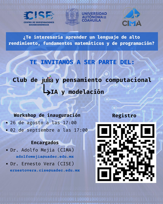 SALTILLO, Coahuila. 21 de agosto de 2025. La Universidad Autónoma de Coahuila a través del Centro de Investigación en Matemáticas Aplicadas (CIMA) y el Centro de Investigaciones Socioeconómicas (CISE), invita al Club de Julia: Inteligencia Artificial y Modelación, con un Workshop de inauguración que se llevará a cabo el 26 de agosto y el 2 de septiembre de 2025.