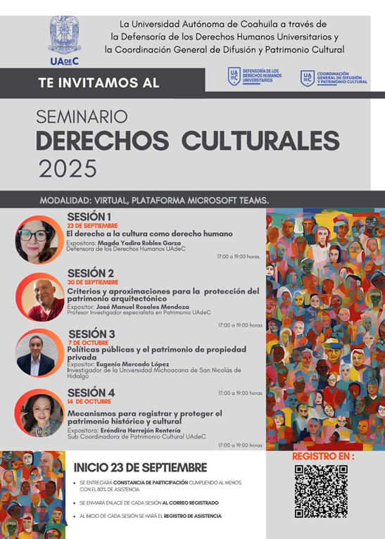 SALTILLO, Coahuila. 28 de agosto de 2025. La Universidad Autónoma de Coahuila a través de la Defensoría de Derechos Humanos Universitarios y la Coordinación General de Difusión y Patrimonio Cultural, invita al Seminario “Derechos Culturales 2025”, que se llevará a cabo del 23 de septiembre al 14 de octubre.