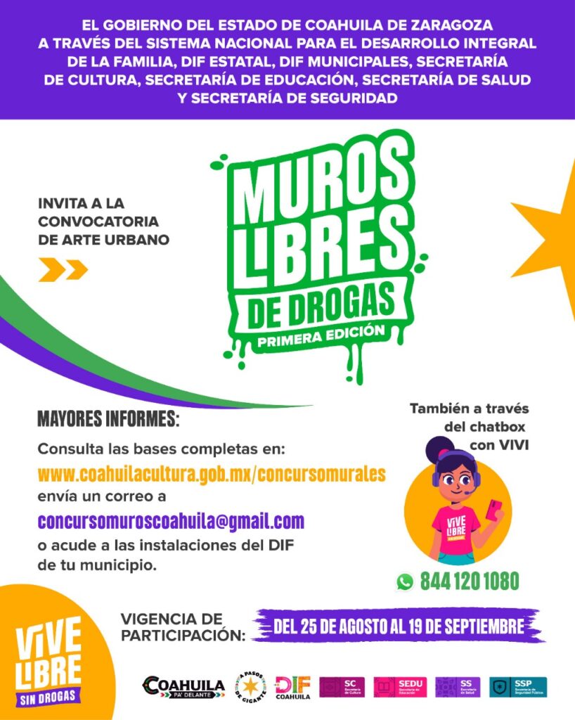 Saltillo Coahuila, a 5 de septiembre de 2025.- El Gobierno del Estado de Coahuila de Zaragoza, a través de la Secretaría de Cultura, invita a todas y todos los jóvenes artistas urbanos de la entidad a participar en la convocatoria “Muros Libres de Drogas”, un proyecto que busca transformar los espacios públicos en lienzos de esperanza, creatividad y vida.