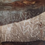 Otra figura abstracta, pero muy llamativa, es una formada por tres rectángulos verticales de más de medio metro y con una línea igualmente vertical de 15 puntos. Entre las astas una muy esquematizada de venado cola blanca. Vale la pena hablar de que aparece por primera vez una clara huella de venado. En toda la región se grabaron huellas sueltas y rastros.