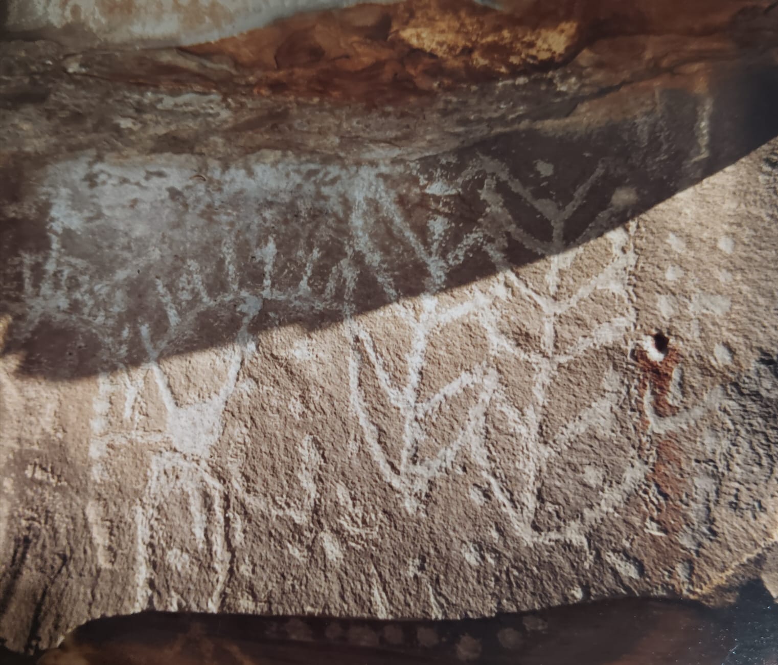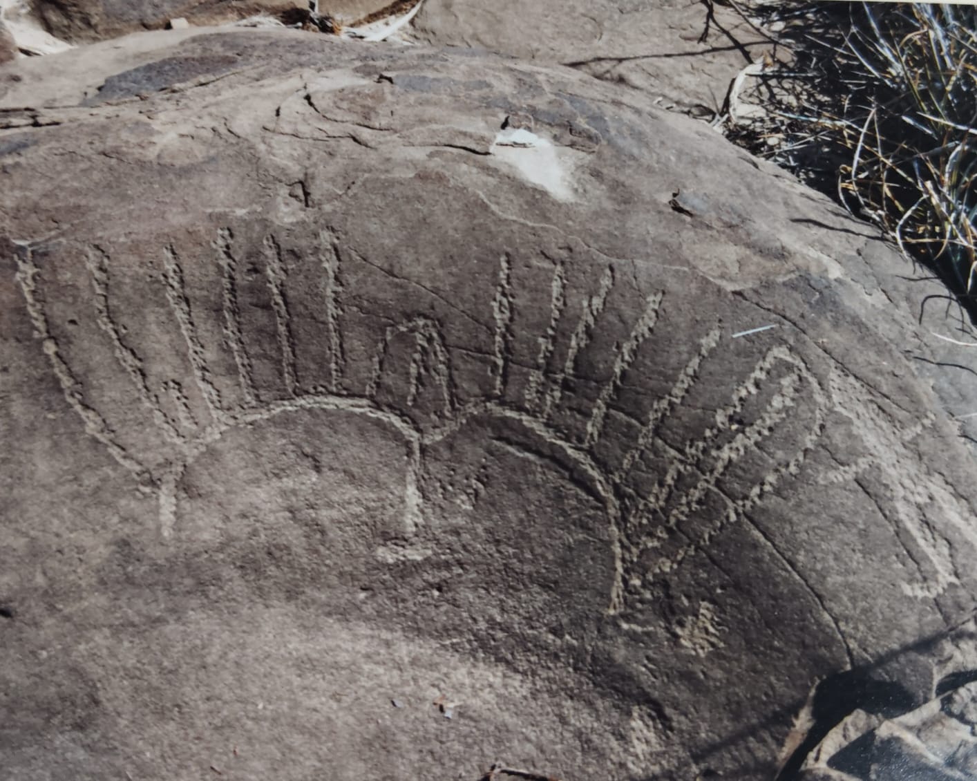 Otra figura abstracta, pero muy llamativa, es una formada por tres rectángulos verticales de más de medio metro y con una línea igualmente vertical de 15 puntos. Entre las astas una muy esquematizada de venado cola blanca. Vale la pena hablar de que aparece por primera vez una clara huella de venado. En toda la región se grabaron huellas sueltas y rastros.