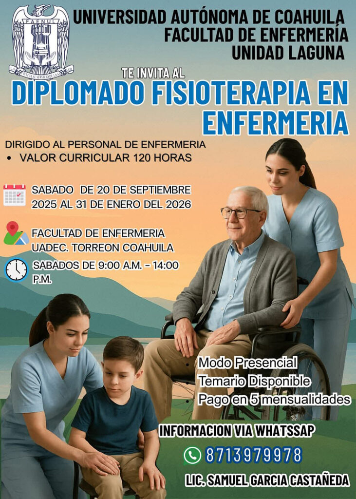 Por su parte, el Diplomado en Fisioterapia en Enfermería está orientado al personal de enfermería y contará con un valor curricular de 120 horas, se desarrollará de manera presencial los sábados de 9:00 a 14:00 horas en las instalaciones de la Facultad del 20 de septiembre de 2025 al 31 de enero de 2026; este programa contempla la opción de pago en cinco mensualidades y cuenta con un temario disponible para las y los interesados.