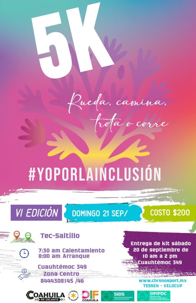 Saltillo, Coahuila de Zaragoza; 18 de septiembre de 2025.- ¡La inclusión se vive en movimiento! La Secretaría de Inclusión y Desarrollo Social, en conjunto con el DIF Coahuila, invita a todas y todos a sumarse a la sexta edición de la carrera 5K “Yo por la Inclusión: rueda, camina, trota o corre”, este domingo 21 de septiembre a las 7:30 de la mañana, teniendo como punto de reunión el Tec Saltillo.