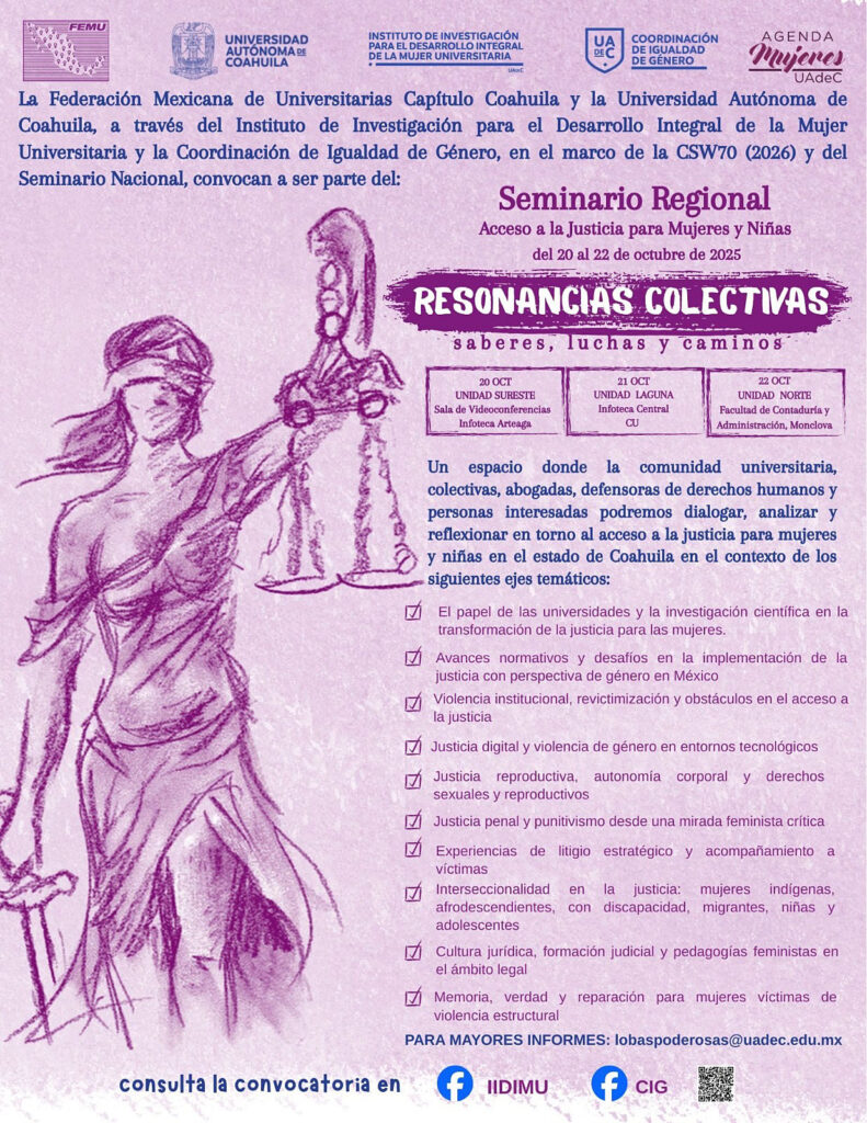 SALTILLO, Coahuila. 23 de septiembre de 2025. La Universidad Autónoma de Coahuila, a través del Instituto de Investigación para el Desarrollo Integral de la Mujer Universitaria (IIDIMU) y la Coordinación de Igualdad de Género, en conjunto con la Federación Mexicana de Universitarias Capítulo Coahuila, invitan a la comunidad universitaria al Seminario Regional Acceso a la Justicia para Mujeres y Niñas: Resonancias Colectivas, saberes, luchas y caminos.