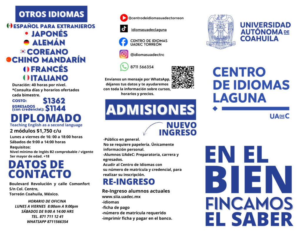 TORREÓN, Coahuila. 15 de octubre de 2025. El Centro de Idiomas Unidad Laguna de la Universidad Autónoma de Coahuila invita a la comunidad universitaria y al público en general a inscribirse a sus cursos de idiomas correspondientes al próximo periodo, con opciones en modalidad entre semana o sabatina, con programas para niños, adolescentes y adultos.