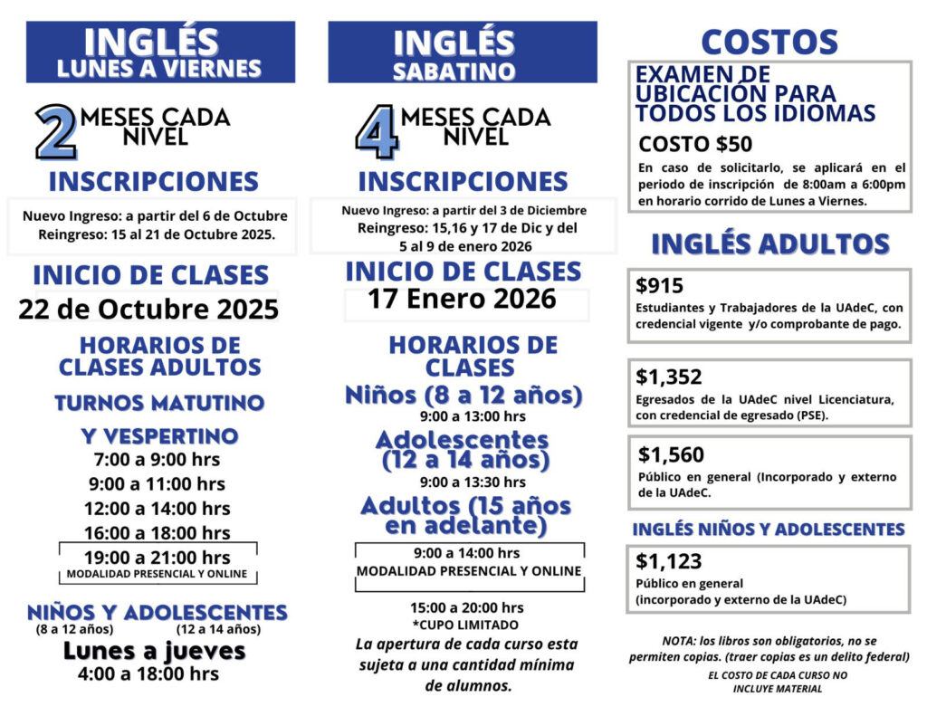 Las inscripciones para los cursos de inglés de lunes a viernes para nuevo ingreso se encuentran abiertas desde el 6 de octubre, para reingreso del 15 al 21 de octubre de 2025 y las clases iniciarán el 22 de octubre de 2025.