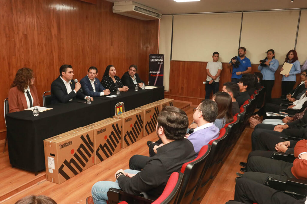 SALTILLO, Coahuila. 15 de octubre de 2025. En la Facultad de Economía Unidad Sureste de la Universidad Autónoma de Coahuila, tomó protesta el Capítulo Estudiantil del Colegio de Economistas de Coahuila A.C y el rector Octavio Pimentel Martínez, entregó al plantel 25 equipos de cómputo.