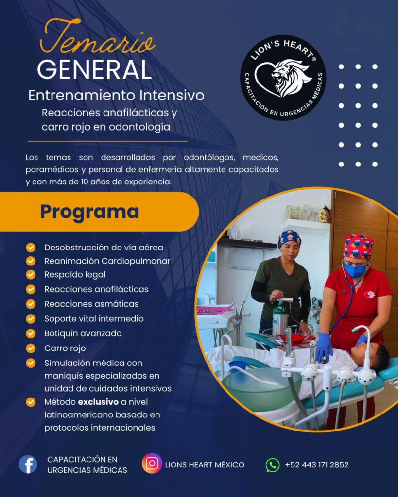 Lion’s Heart México se especializa en cursos y giras de capacitación en medicina de emergencias, específicamente en el área de odontología, ofreciendo entrenamiento intensivo y certificación en el manejo de urgencias médicas dentro de consultorios dentales.