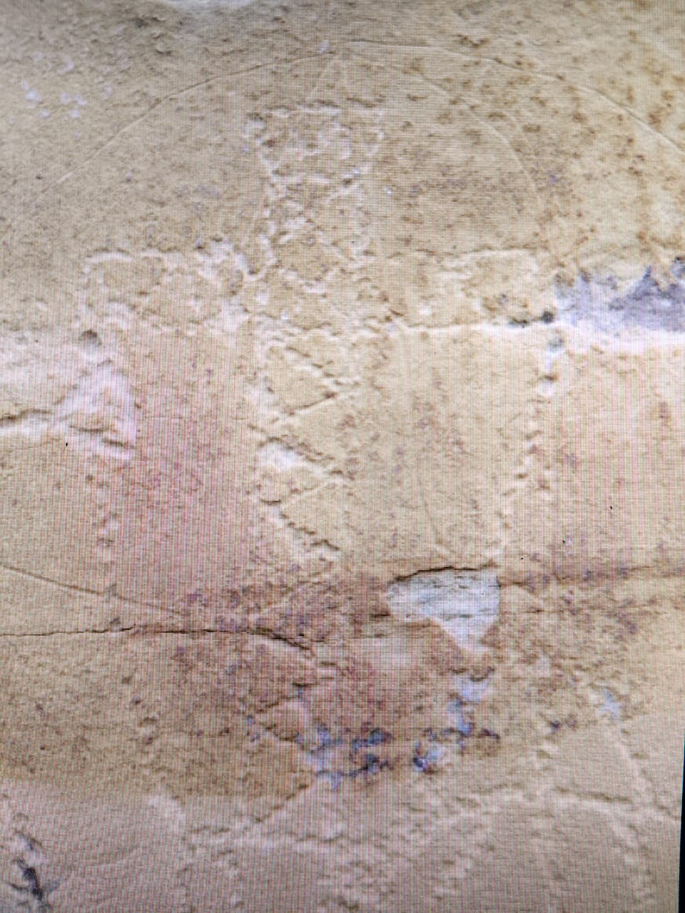 Al fondo del cañón cerca de donde se localiza el ave, escondido se pudo encontrar otro personaje de más de más de medio metro con los brazos extendidos, le marcaron muy bien sus dedos; una cabeza redondeada sin tocado sólo se le grabó un ojo y la boca abierta, el torso cuadrado y sus dos extremidades inferiores; el rostro está de perfil y da la impresión de disgusto. Aunque pocas se observan algunas cuentas a base de puntos y otras a base de rayas.