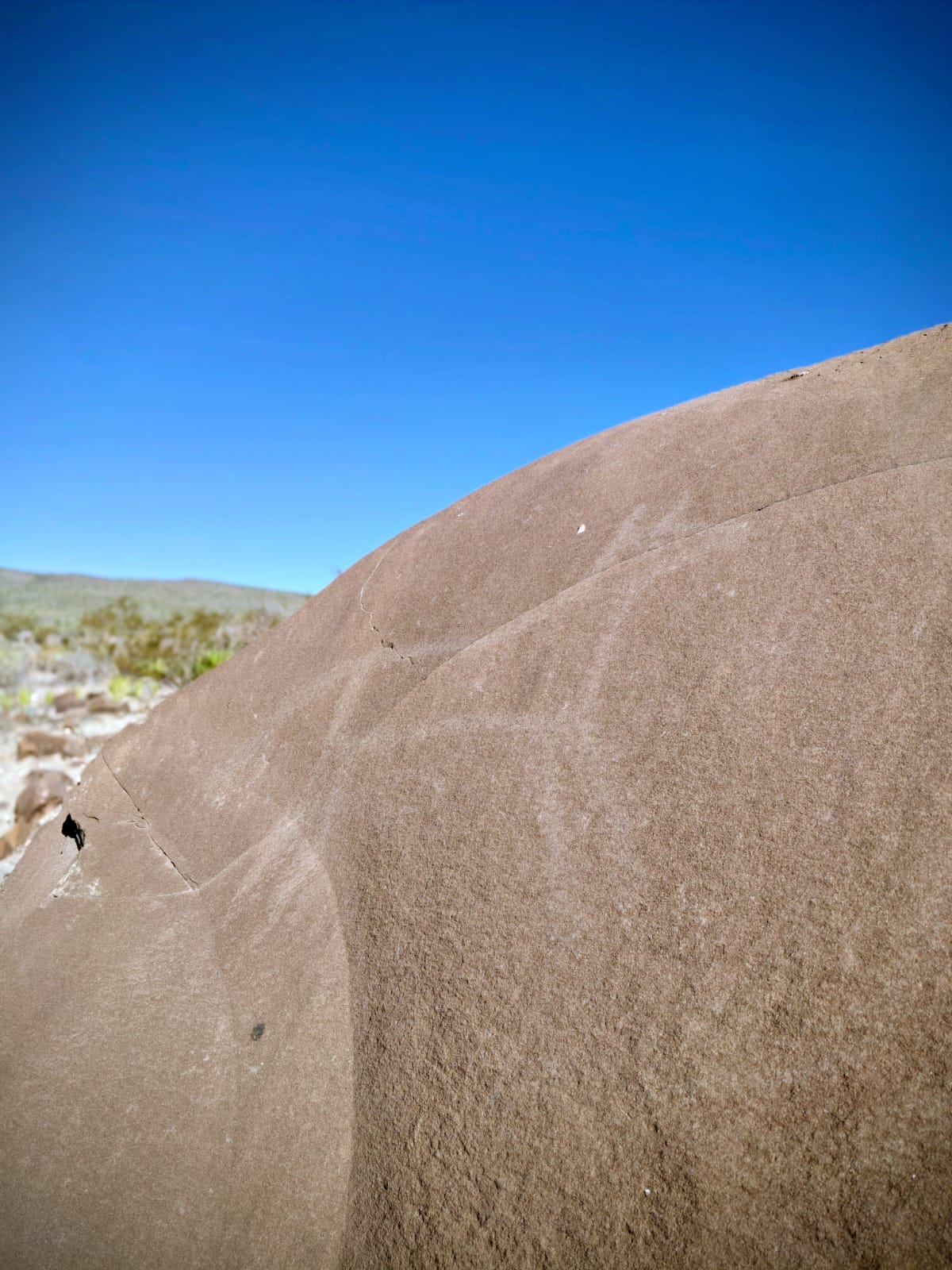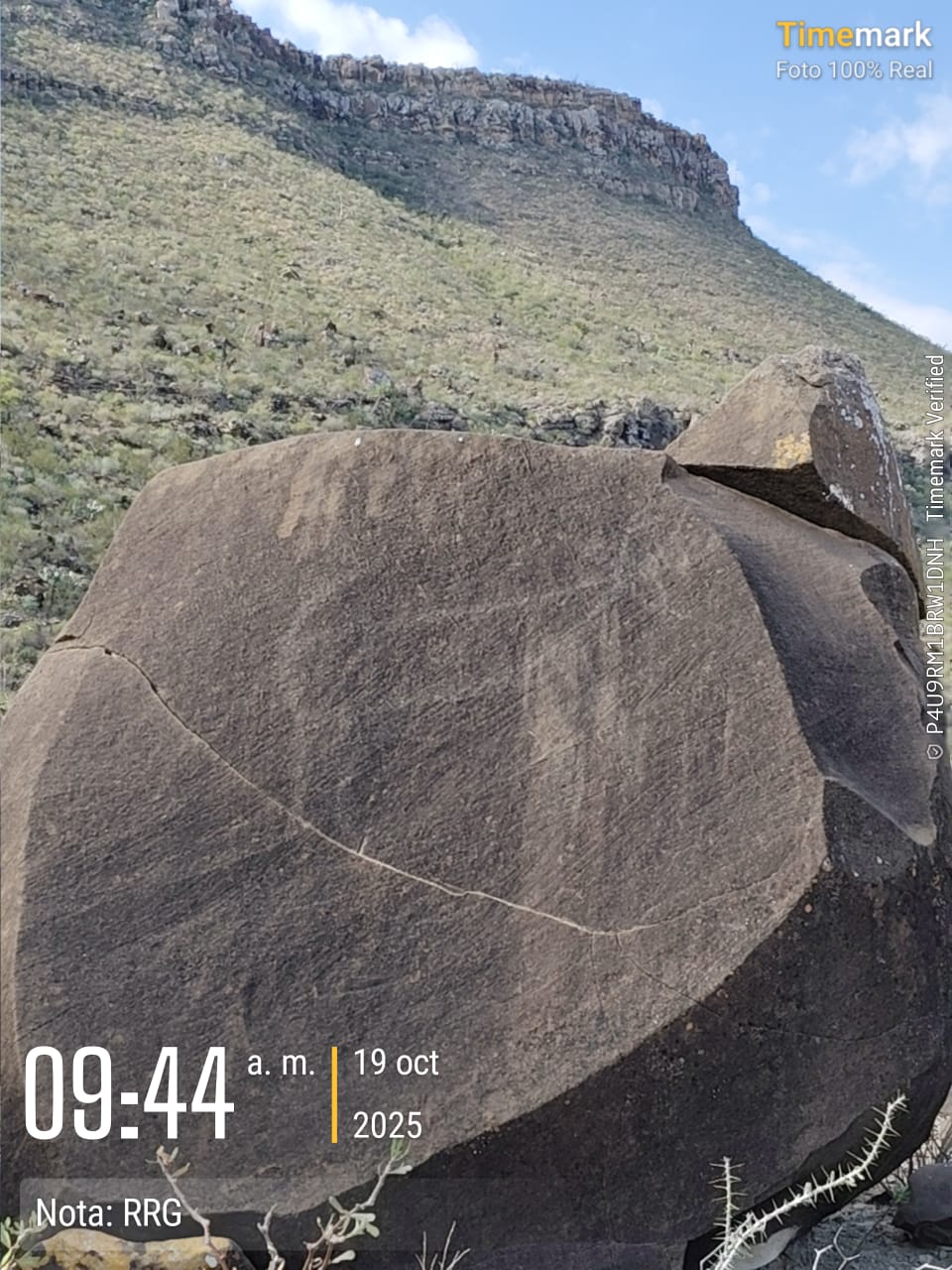 En una roca no lejos del mencionado venado, otra piedra de grandes dimensiones y que en el lugar más alto de la misma se encuentra un animal con delineado superficial que a mi parecer se trata de un coyote.