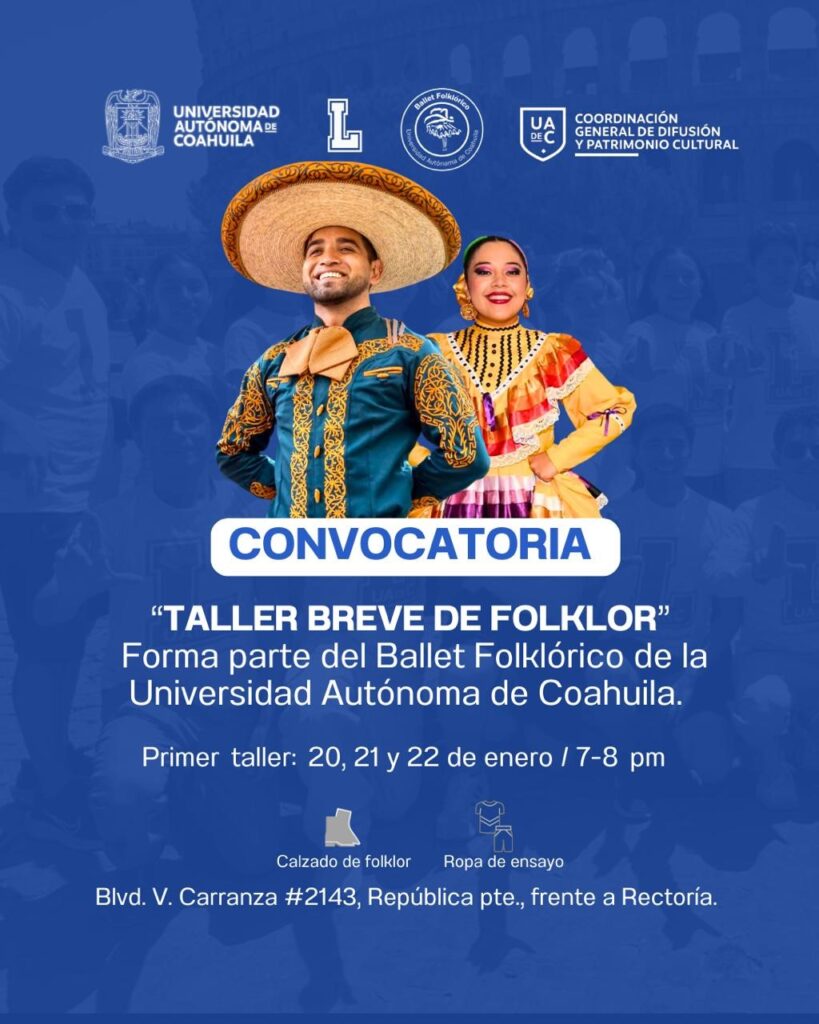 Saltillo, Coahuila. 13 de enero de 2026. La Universidad Autónoma de Coahuila a través de la Coordinación General de Difusión y Patrimonio Cultural, convoca a su comunidad universitaria y público en general con experiencia en danza folklórica, a participar en la “CONVOCATORIA 2026” para integrarse al elenco del Ballet Folklórico de la UAdeC.
