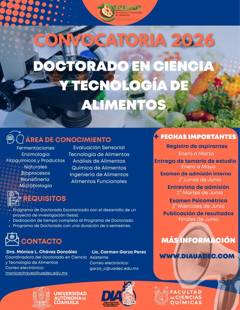 SALTILLO, Coahuila. 19 de enero de 2026. La Universidad Autónoma de Coahuila a través de la Facultad de Ciencias Químicas, invita a cursar el Doctorado en Ciencia y Tecnología de Alimentos, que está dirigido a maestros en ciencias de las áreas de Química, Nutrición, Biología Molecular, Evaluación Sensorial, Microbiología, Tecnología de Alimentos, Ingeniería de Alimentos, Biotecnología, Ingeniería Química, Bioingeniería y áreas afines.
