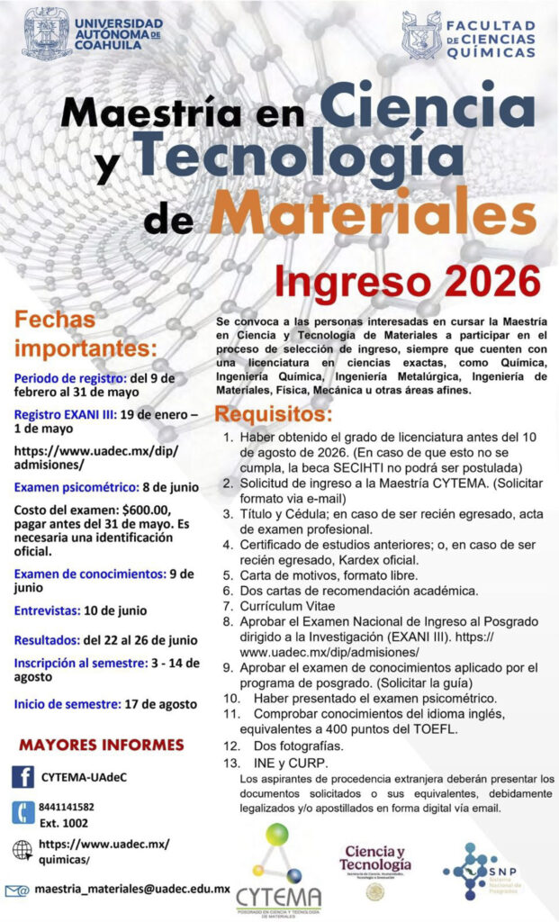 SALTILLO, Coahuila. 25 de febrero de 2026. La Universidad Autónoma de Coahuila a través de la Facultad de Ciencias Químicas, convoca a egresados de licenciaturas en ciencias exactas como Química, Ingeniería Química, Ingeniería Metalúrgica, Ingeniería de Materiales, Física, Matemáticas o de áreas afines, a postularse para ingresar a la Maestría en Ciencia y Tecnología de Materiales para el semestre agosto-diciembre 2026.