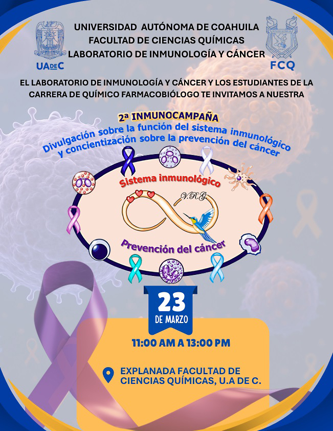 SALTILLO, Coahuila. 20 de marzo de 2026. Para acercar a la población la información científica sobre el sistema inmunológico y la prevención del cáncer, la Universidad Autónoma de Coahuila, a través de la Facultad de Ciencias Químicas (FCQ) y su Laboratorio de Inmunología y Cáncer, llevará a cabo la segunda edición de su Inmunocampaña de Divulgación sobre “el Sistema Inmunológico y Concientización sobre la Prevención del Cáncer”, a realizarse este próximo lunes 23 de marzo de 2026, en horario de 11:00 a 13:00 horas en la explanada del plantel.