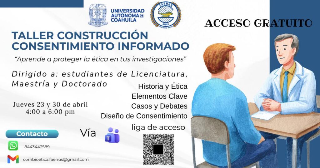 SALTILLO, Coahuila. 20 de abril de 2026. La Universidad Autónoma de Coahuila, a través de la Facultad de Enfermería y Nutrición “Dr. Santiago Valdés Galindo” (FAENUS) y su Comité de Ética en Investigación, convoca a estudiantes de Licenciatura, Maestría y Doctorado del área de la salud a participar en el Taller “Construcción del Consentimiento Informado”, que se llevará a cabo los días 23 y 30 de abril de 2026.