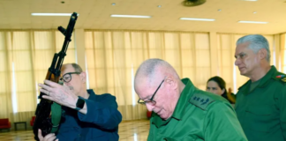 La Habana, Cuba.– El cantautor cubano Silvio Rodríguez recibió una réplica de un fusil AKM durante una ceremonia oficial realizada en la...