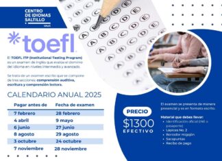 SALTILLO, Coahuila. 30 de julio de 2025. El Centro de Idiomas Unidad Sureste de la Universidad Autónoma de Coahuila, invita a presentar el Examen TOEFL Institutional Testing Program (ITP), el cual tiene...
