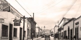Calle de Victoria en la zona centro de Saltillo, se observa la catedral de Santiago al fondo, año de 1934